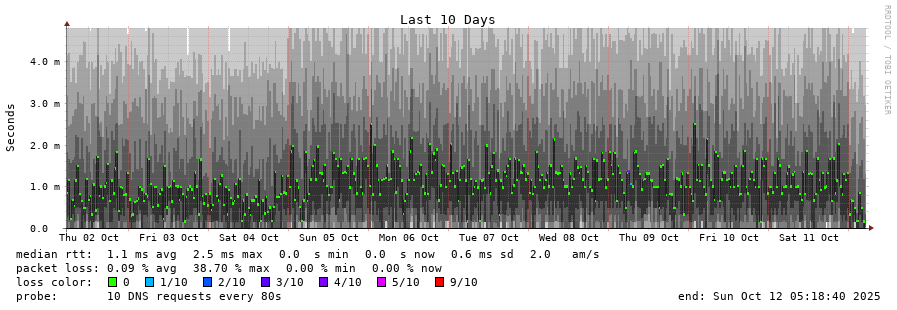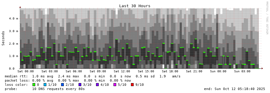 traceroute to 199.7.91.13 (199.7.91.13), 30 hops max, 60 byte packets - Generated at 2025-10-12 05:00:01 3 > 206.53.175.27 (206.53.175.27) [*] 0.582ms 0.448ms 0.402ms 4 > d.root-servers.net (199.7.91.13) [AS10886] 0.617ms 0.482ms 0.699ms