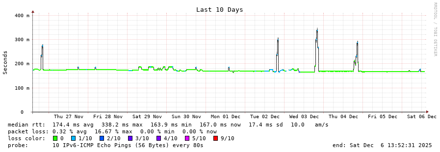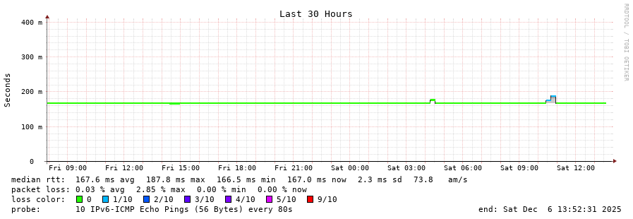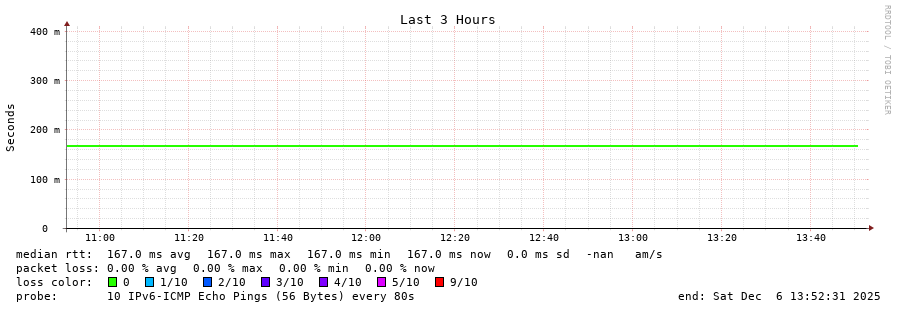 12 > 2001:4350:0:1010::3 (2001:4350:0:1010::3) [AS5438] 169.027ms 168.720ms 168.834ms