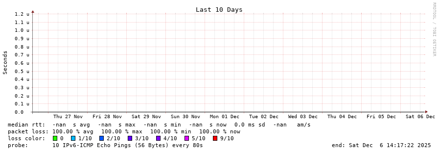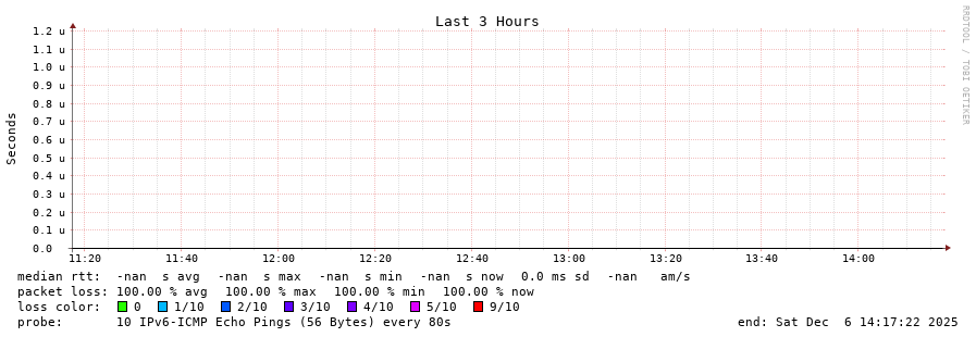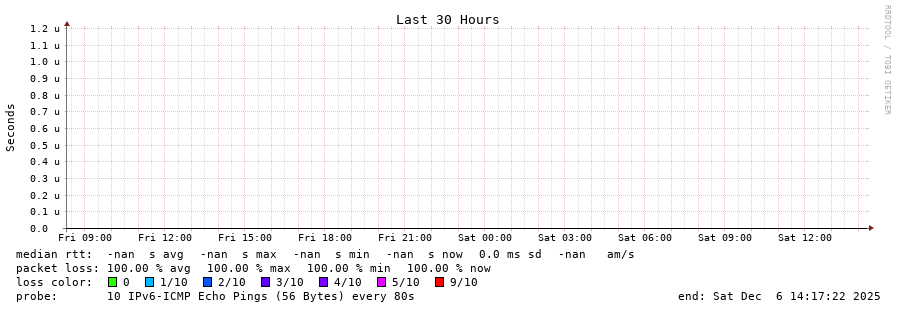 traceroute to fd69:226f:3a3c::2 (fd69:226f:3a3c::2), 30 hops max, 80 byte packets - Generated at 2025-12-06 13:30:01 3 > 4 > 5 > 6 > 7 > 8 > 9 > 10 > 11 > 12 > 13 > 14 > 15 > 16 > 17 > 18 > 19 > 20 > 21 > 22 > 23 > 24 > 25 > 26 > 27 > 28 > 29 > 30 >