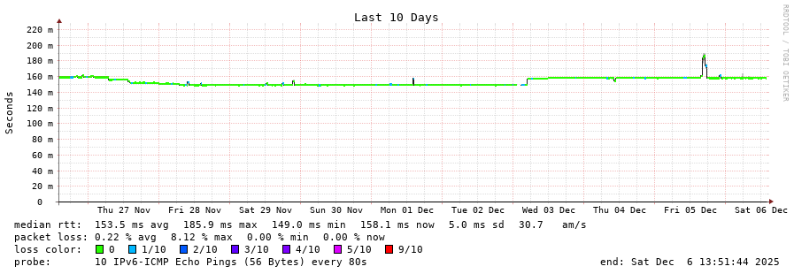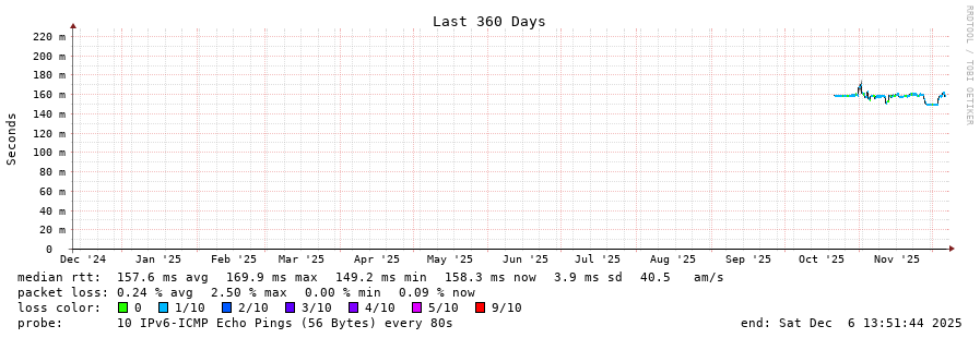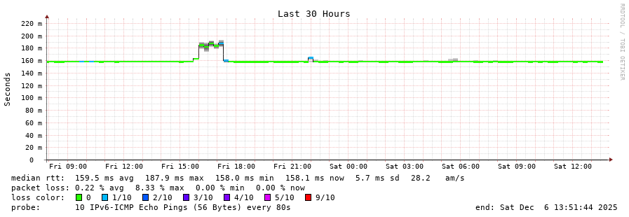 traceroute to 2a0b:2f00:0:234::151 (2a0b:2f00:0:234::151), 30 hops max, 80 byte packets - Generated at 2025-12-06 13:30:01